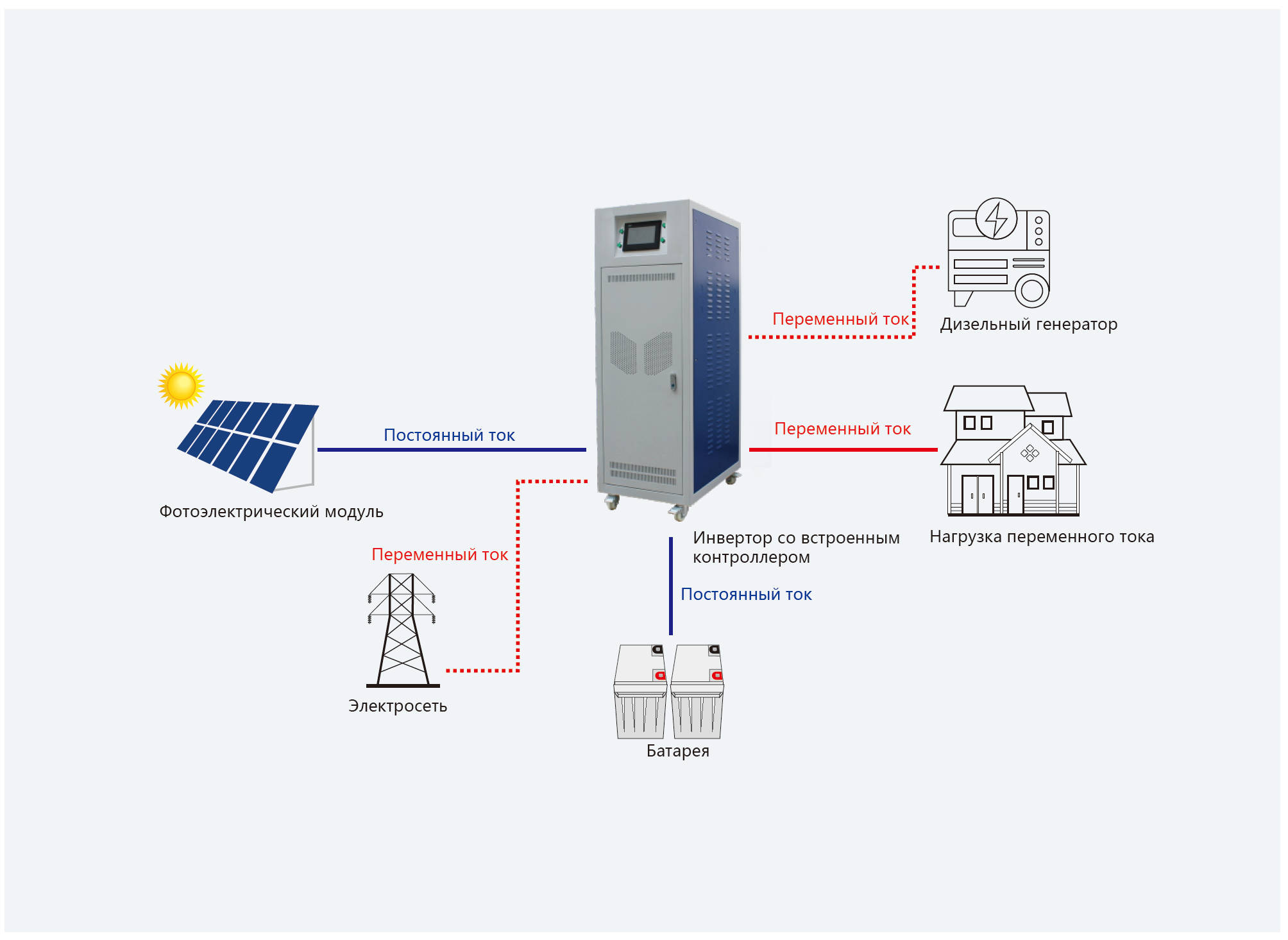 Системы солнечной электрогенерации широко используются в отдаленных горных районах, в регионах без электричества, на островах, на коммуникационных базовых станциях, для уличных фонарей и т.д. Матрица фотоэлектрических элементов в условиях освещенности преобразовывает солнечную энергию в электроэнергию, через контроллер заряда и разряда происходит подача энергии, а также зарядка батарей. Во время отсутствия освещения батареи через контроллер заряда и разряда подает электроэнергию прямой нагрузкой при постоянном токе. Одновременно батарея подает электроэнергию напрямую отдельному инвертору, который преобразует электроэнергию в переменный ток, подавая электрожнергию нагрузкой в режиме переменного тока.