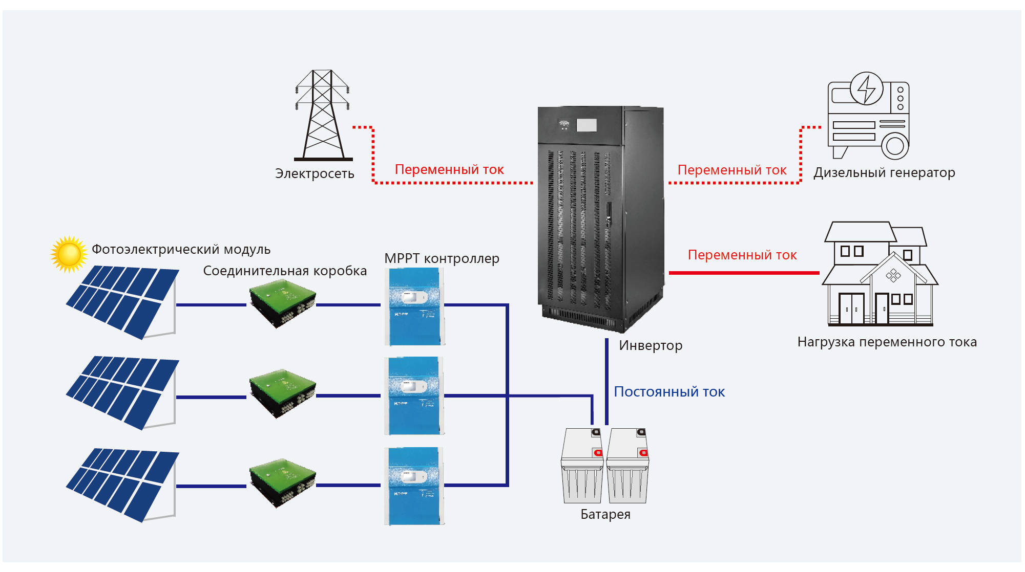 Системы солнечной электрогенерации широко используются в отдаленных горных районах, в регионах без электричества, на островах, на коммуникационных базовых станциях, для уличных фонарей и т.д. Матрица фотоэлектрических элементов в условиях освещенности преобразовывает солнечную энергию в электроэнергию, через контроллер заряда и разряда происходит подача энергии, а также зарядка батарей. Во время отсутствия освещения батареи через контроллер заряда и разряда подает электроэнергию прямой нагрузкой при постоянном токе. Одновременно батарея подает электроэнергию напрямую отдельному инвертору, который преобразует электроэнергию в переменный ток, подавая электрожнергию нагрузкой в режиме переменного тока.